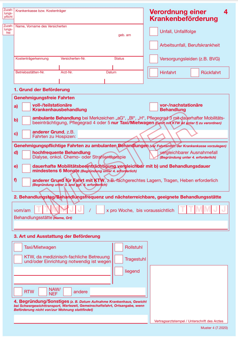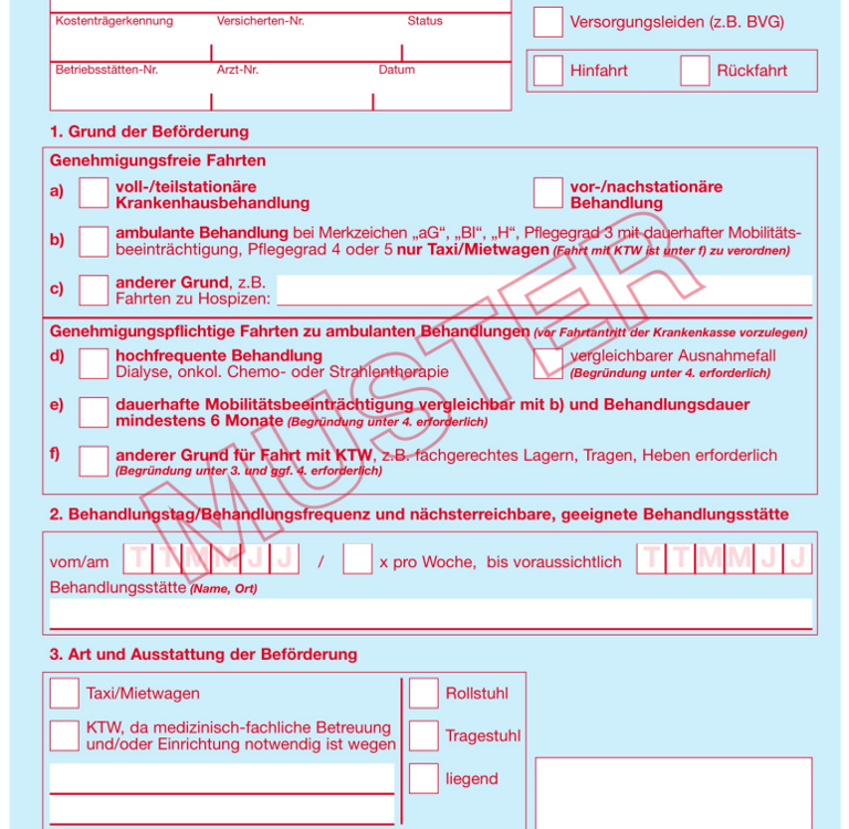 Genehmigung durch die Krankenkasse: In den meisten Fällen muss die Verordnung vor der Fahrt bei der Krankenkasse eingereicht und genehmigt werden. Dies gilt vor allem für ambulante Fahrten. Für stationäre Behandlungen oder Notfälle ist in der Regel keine vorherige Genehmigung notwendig.